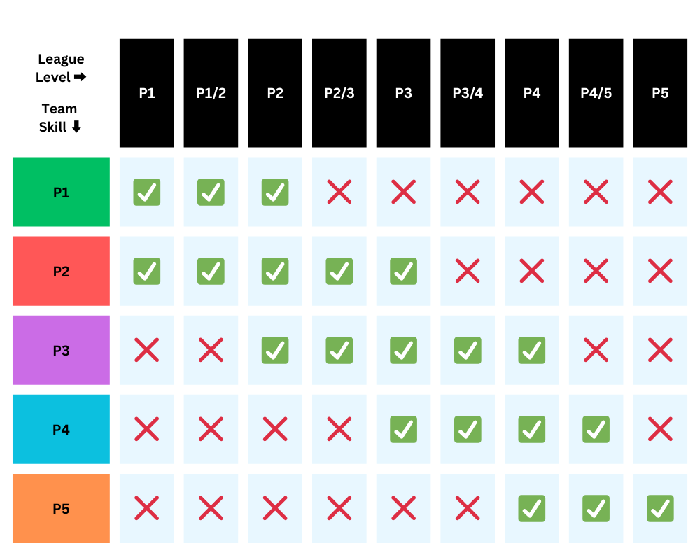 Please note, league levels may be changed during or after a registration window if rosters and registrations inform the change. For instance, if a P2 division is seeing a majority of teams fall into the P3 category, the division will change to a P2/3 or a P3.